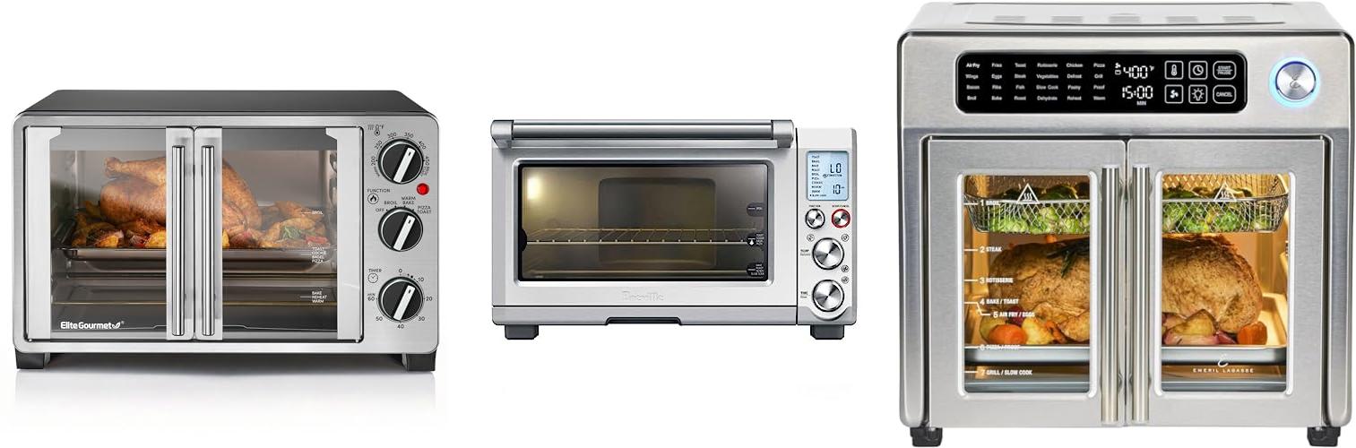 The Elite Gourmet ETO2530M Double French Door Countertop Toaster Oven is a versatile kitchen helper. It can bake, broil, toast, and keep food warm. This oven is great for making pizzas up to 12 inches. Its sleek stainless steel and black design looks good on any counter.