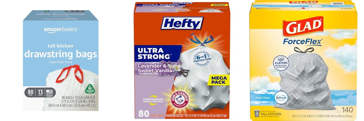 Amazon Basics 13 Gallon Tall Kitchen Drawstring Trash Bags | 9.4/10 | Check Price |